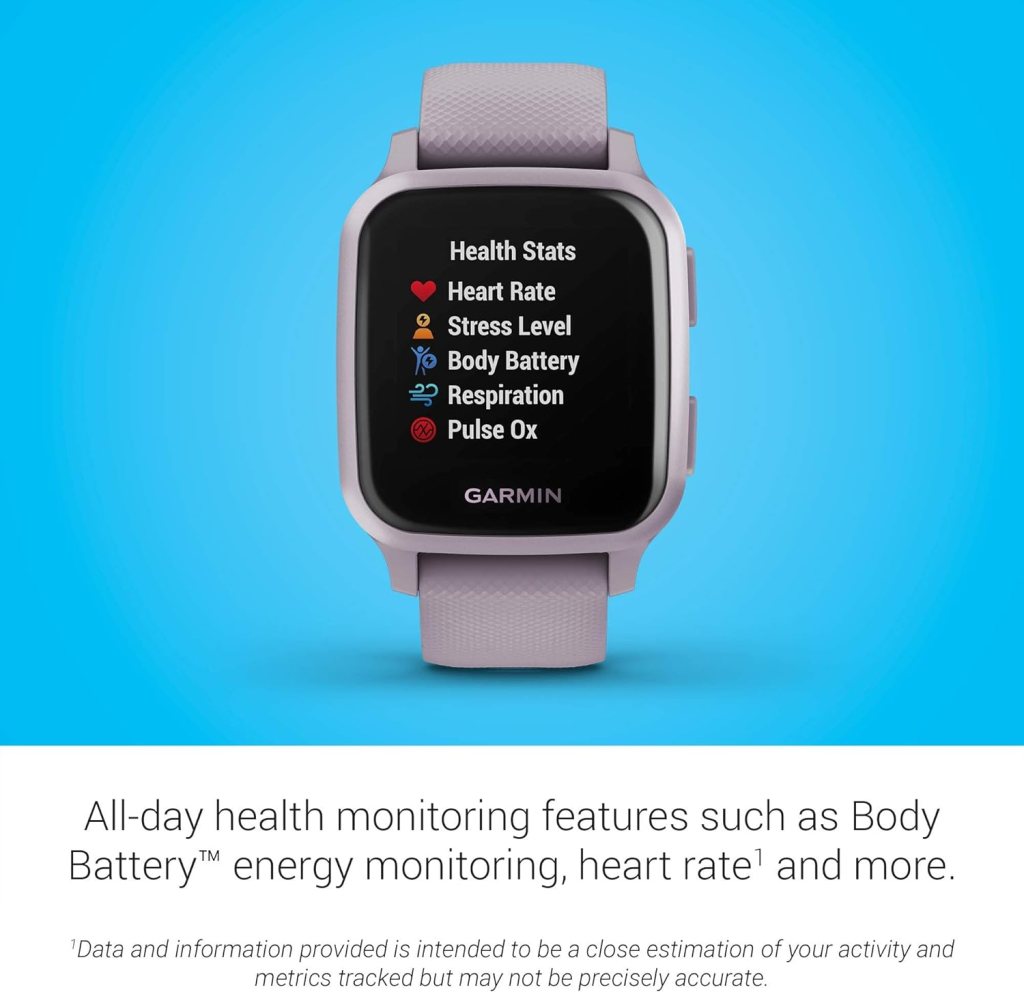 With the Garmin Venu Sq, you’ll have access to a wealth of information right at your fingertips. From monitoring your Body Battery energy levels, respiration, hydration, and stress to tracking your sleep, menstrual cycle, and estimated heart rate, this smartwatch provides a comprehensive picture of your overall health. It’s like having a personal wellness coach right on your wrist!