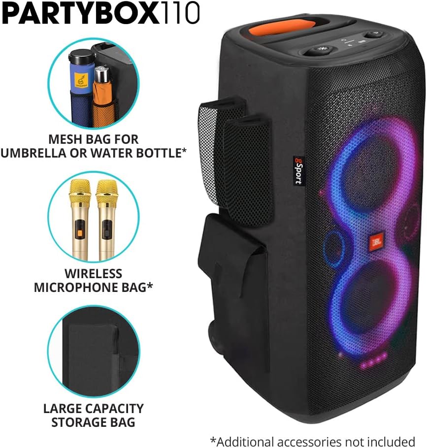 The JBL PartyBox 110 truly impresses with its sturdy construction and modern design. The speaker feels robust, making it ideal for both indoor and outdoor use. The gSport Cargo Sleeve adds an extra layer of protection while giving you more storage options for your accessories.