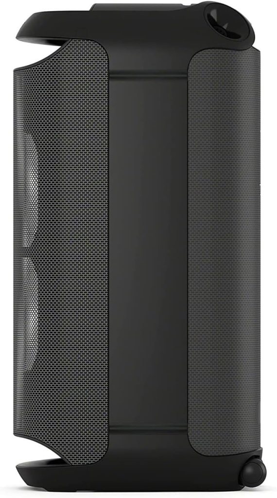 When you lay eyes on the Sony SRS-XV800 speaker, the first thing you’ll notice is its sleek and stylish design. With its black color and compact shape, it’s ready to accompany you to any party or gathering. Its IPX4 water-resistance rating means you can take it outdoors without worrying about a sudden downpour ruining the fun.