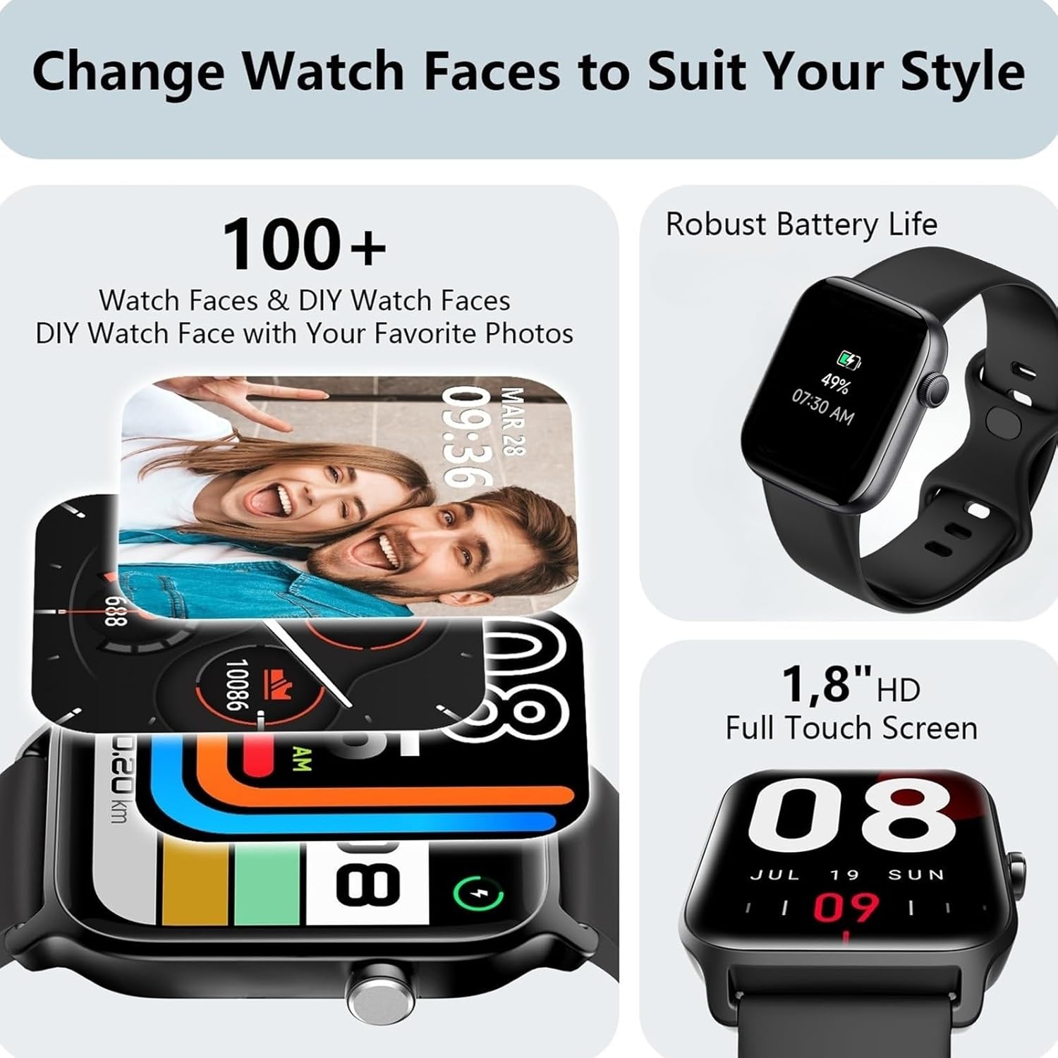 The Smart Watch boasts a 1.85″ HD Full Touch Color Screen for a visually engaging experience. With highly responsive touch capabilities, you can navigate effortlessly through various features and apps. Use the ‘Hiwatch Pro’ app to access a wide range of personalized watch faces or set your favorite photos as your wallpaper for a unique and customized look.